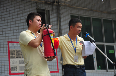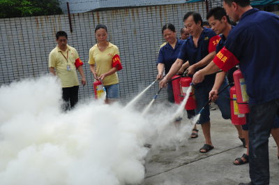 員工安全抵達(dá)廠外后領(lǐng)導(dǎo)開始講解滅火器使用方法